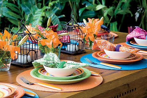 Fica lindo né! Uma vez ví uma toalha de mesa feita de bandanas coloridas... Ficou um charme! E essas gaiolinhas de centro de mesa! Adorei..Um beijo, Naara.http://falandoemsonhos.blogspot.com